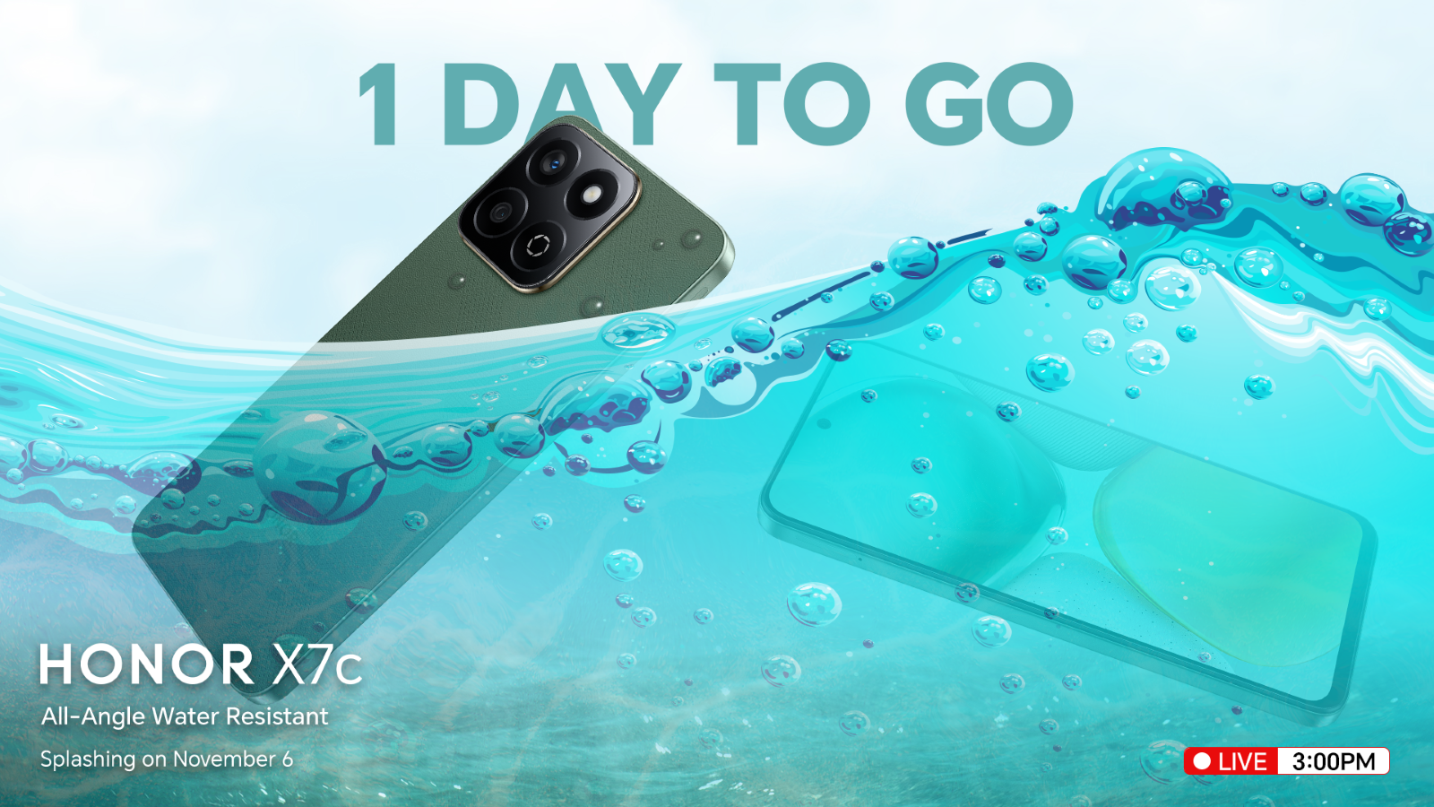 1 Day to Go! Get ready to make waves with the New All-Angle Water-Resistant HONOR X7c