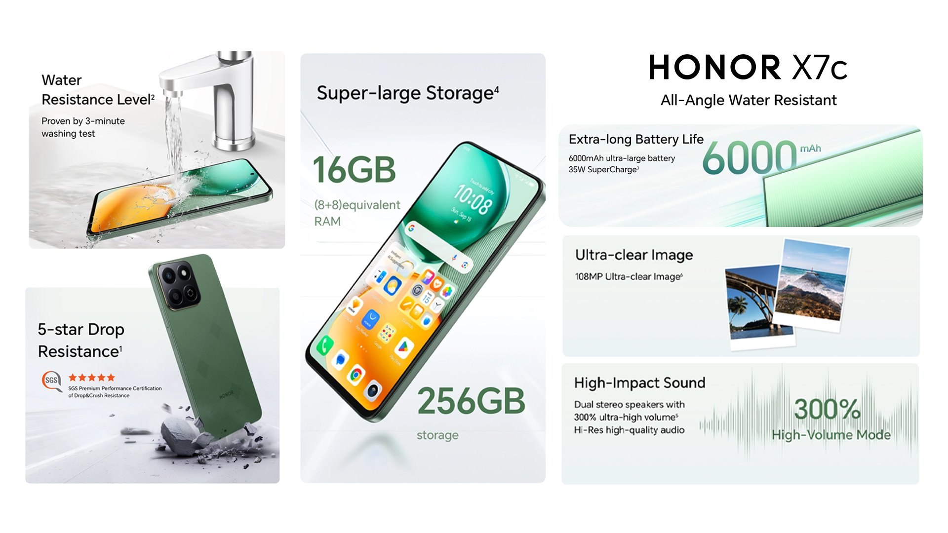 HONOR has implemented an innovative cushioning architecture that works in tandem with tempered glass screen protection to significantly boost the device’s overall impact resistance. This comprehensive approach to durability ensures that the HONOR X7c can withstand the rigors of daily use, providing users with peace of mind and confidence in their device’s longevity. The HONOR X7c sets a new benchmark in smartphone durability with its impressive 5-star Drop Resistance rating. This device has earned the prestigious SGS Premium Performance Certification for Drop & Crush Resistance, underscoring its exceptional build quality and resilience.