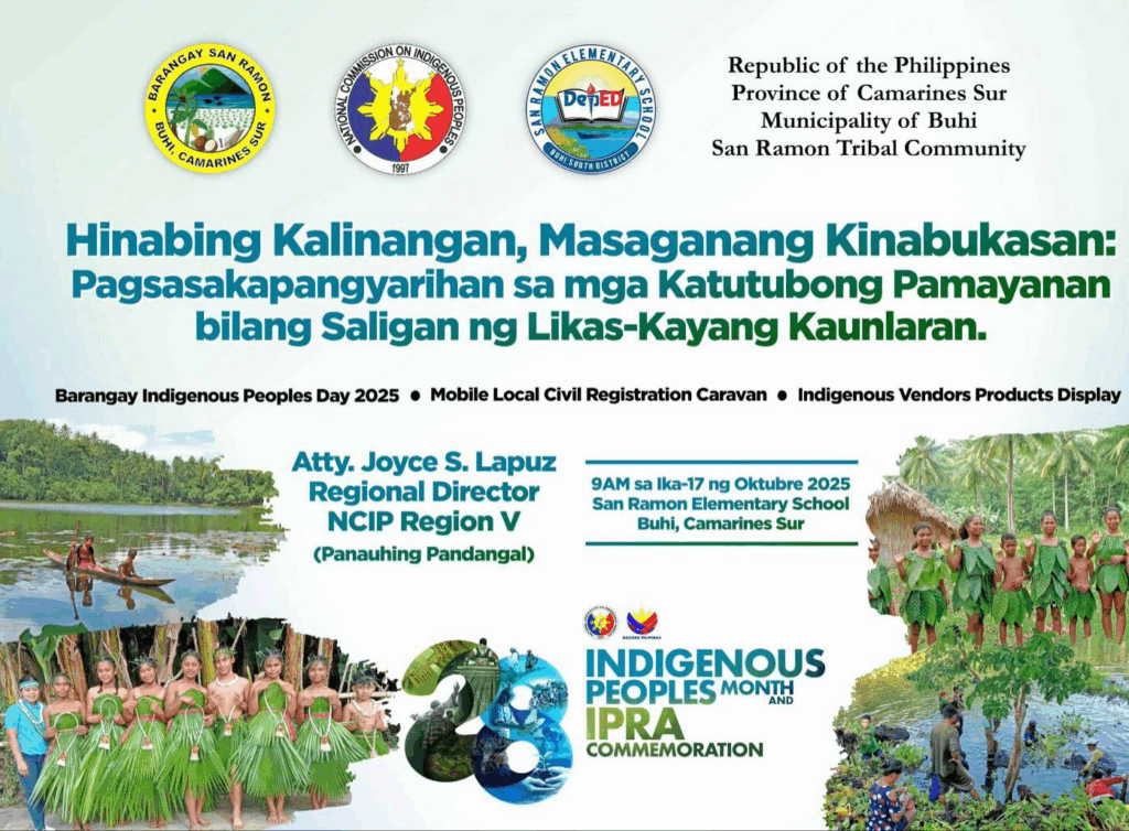 Buhi, Camarines Sur — The vibrant Indigenous Cultural Community of Barangay San Ramon came together on October 17, 2025, to commemorate the Barangay Indigenous Peoples (IP) Day and the 28th Anniversary of the Indigenous Peoples Rights Act (IPRA) under the theme: “Hinabing Kalinangan, Masaganang Kinabukasan: Pagsasakapangyarihan sa mga Katutubong Pamayanan Bilang Saligan ng Likas-Kayang Kaunlaran.”