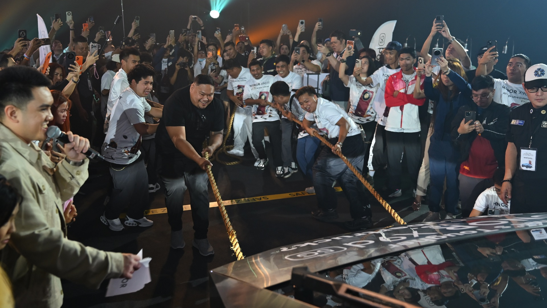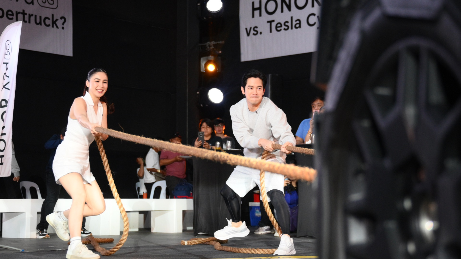 The event featured a series of extreme torture tests between the HONOR X9d 5G and the Tesla Cybertruck: a slingshot hit, a 3-meter throw, a cornhole shot, a decibel test, and, of course, a car-pull runover involving the Tesla Cybertruck and the HONOR X9d 5G—all experienced firsthand by Joshua and Julia.